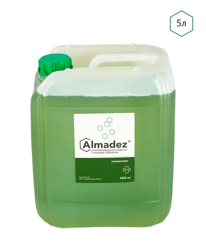 Содержит в своем составе в качестве действующих веществ N,N-бис-(3-аминопропил) додециламина 0,5%, алкилдиметилбензиламмоний хлорида 6%, полигексаметиленгуанидин гидрохлорида 2,3% и поли-(1-гексаметилен) бигуанидин гидрохлорид 0,1%, а также моющий компонент, отдушку и воду. рН 1% водного раствора средства 6,9.