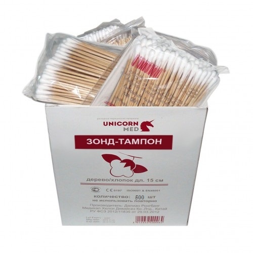 Нестерильный ватный тампон на деревянной палочке предназначен для сбора образцов для лабораторных исследований и других процедур. Тампон изготовлен из хлопка, его размер составляет 150 × 5 мм, а диаметр аппликатора — 2,5 мм. Материалы: хлопок и дерево. Тампоны упакованы в полиэтиленовые пакеты с застёжкой zip-lock, в каждой упаковке содержится 100 штук. Срок годности — 5 лет.
