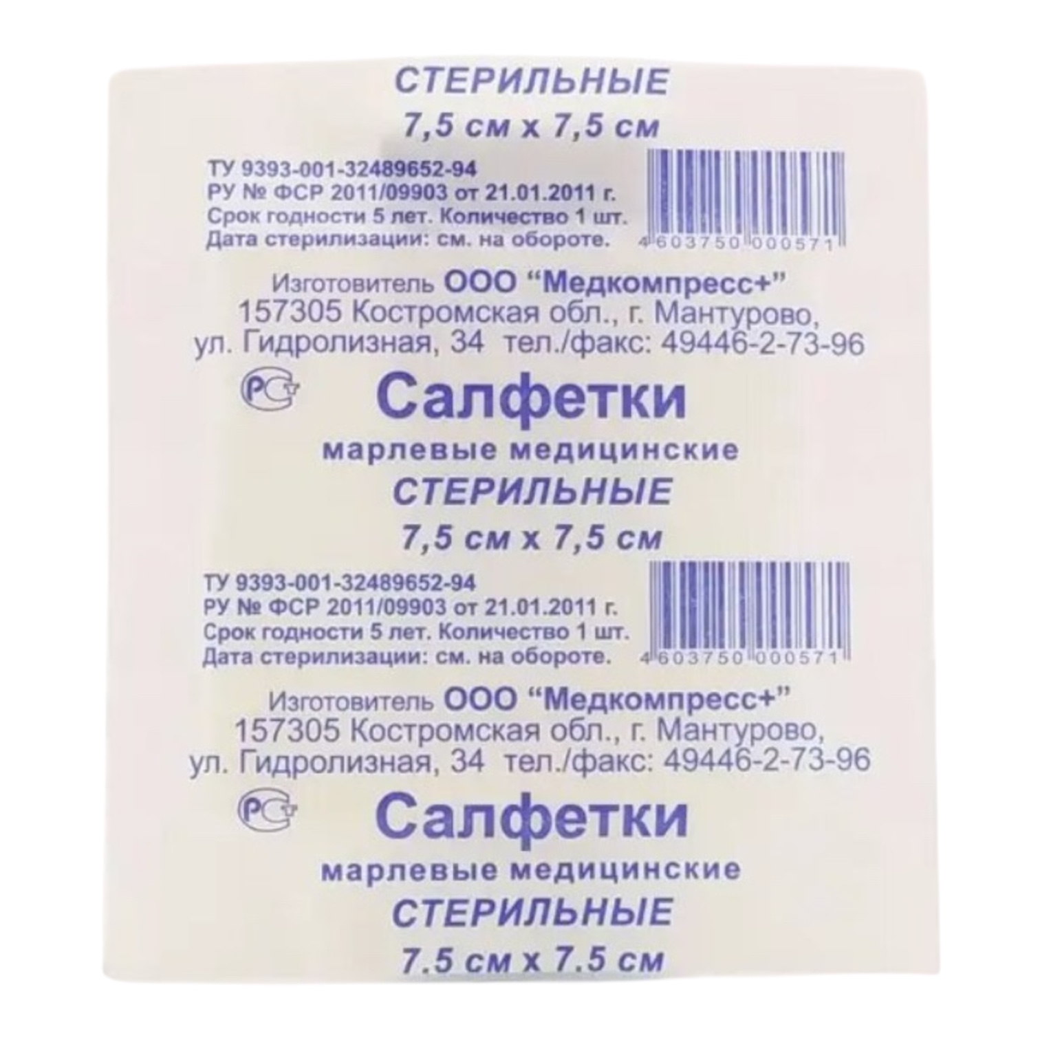 Салфетка стерильная марлевая 8-ми слойная 7,5 х 7,5 см – медицинское изделие, готово к использованию.
