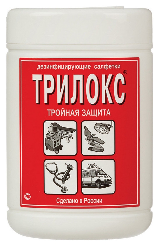 Салфетки «Трилокс» из нетканого материала, пропитанные дезинфицирующим средством «Трилокс-спрей», обеспечивают одновременную очистку и дезинфекцию различных поверхностей от всех типов микроорганизмов. Состав пропитки включает 1-пропанол, четвертичные аммониевые соединения и синергетические добавки.