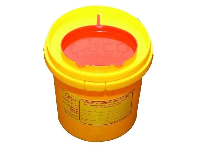 Контейнер-емкость МК-01 МедКом предназначен для безопасного сбора острых медицинских инструментов и эпидемиологически опасных отходов класса Б (желтая маркировка).